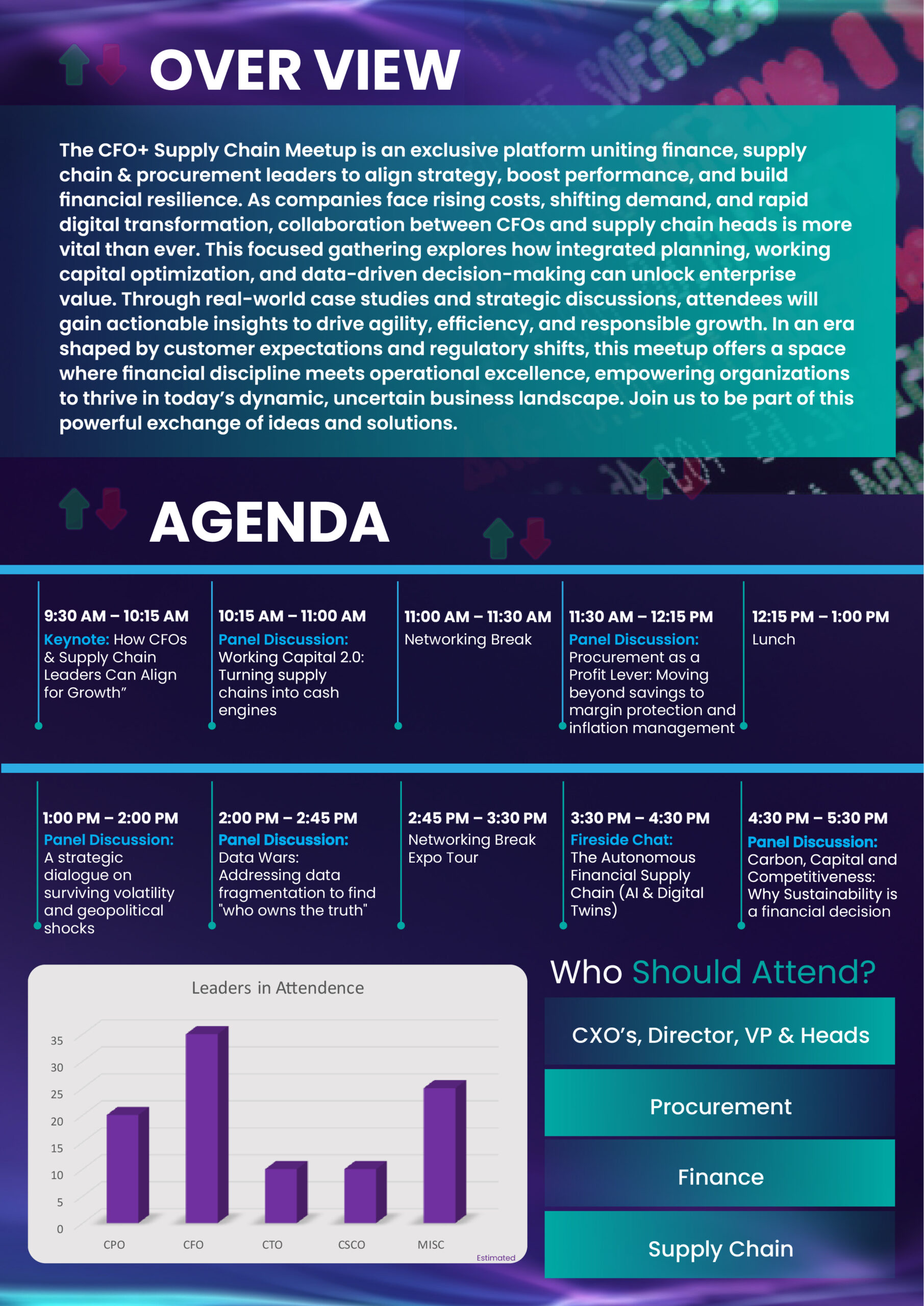 The CFO+ Supply Chain Meetup is an exclusive platform uniting finance, supply chain & procurement leaders to align strategy, boost performance, and build financial resilience. As companies face rising costs, shifting demand, and rapid digital transformation, collaboration between CFOs and supply chain heads is more vital than ever. This focused gathering explores how integrated planning, working capital optimization, and data-driven decision-making can unlock enterprise value. Through real-world case studies and strategic discussions, attendees will gain actionable insights to drive agility, efficiency, and responsible growth. In an era shaped by customer expectations and regulatory shifts, this meetup offers a space where financial discipline meets operational excellence, empowering organizations to thrive in today’s dynamic, uncertain business landscape. Join us to be part of this powerful exchange of ideas and solutions.